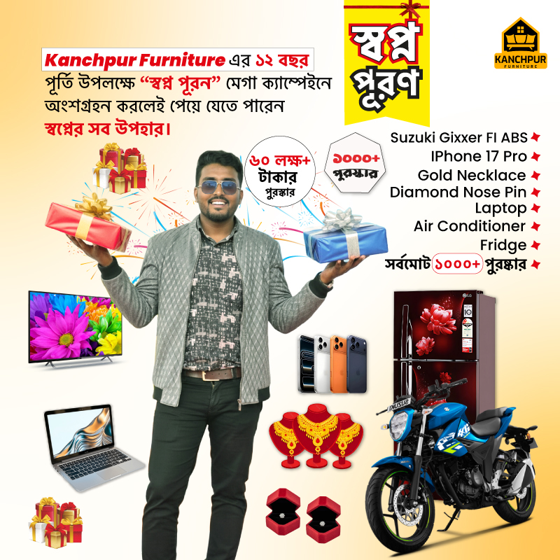 👉 “Kanchpur Furniture থেকে কম্ফোর্টার কিনলেই র্যাফেল ড্র + সাপ্তাহিক ড্র-তে অংশ নেওয়ার সুযোগ।”