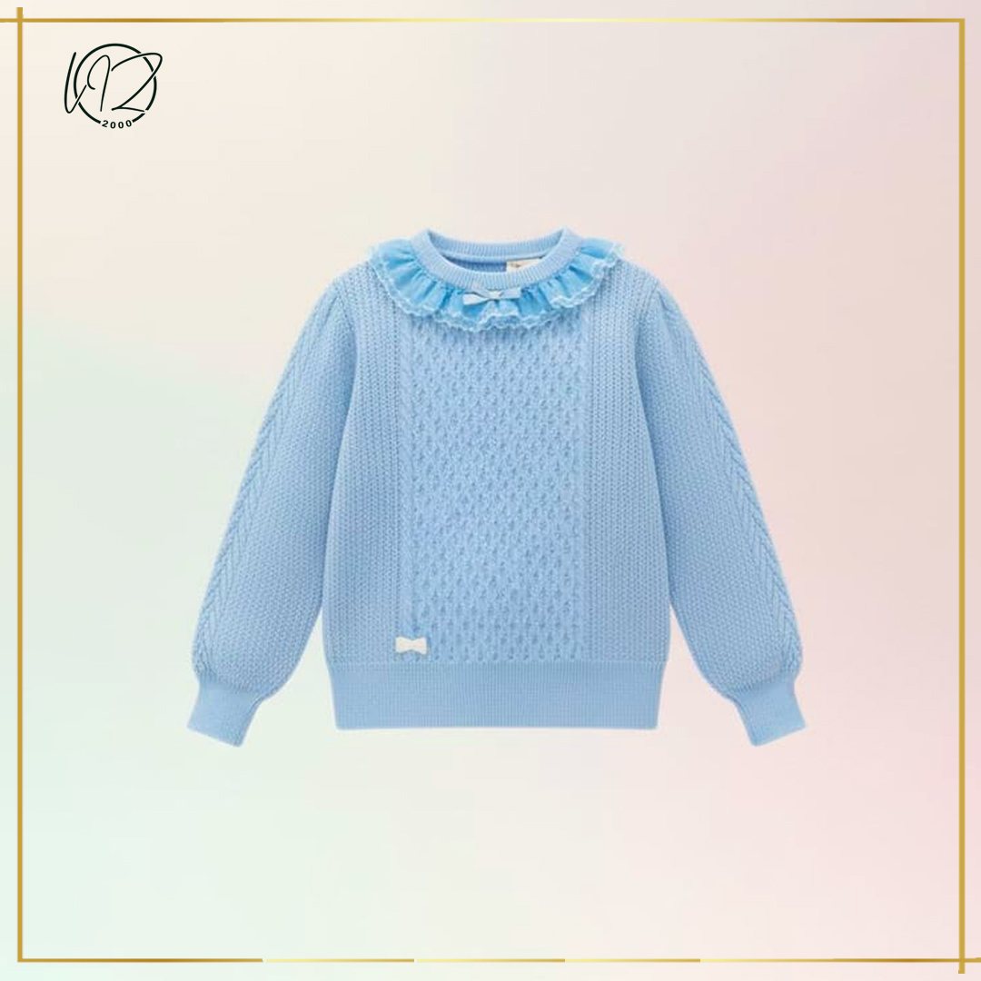 Give her wardrobe a touch of timeless elegance with the Pointelle Knit Sweater. This beautifully crafted piece features an intricate pointelle stitch pattern and a delicate ruffled collar, creating a look that is both sophisticated and sweet. In a soft blue hue, this sweater is as cozy as it is stylish, ensuring she stays warm without sacrificing her favorite look.